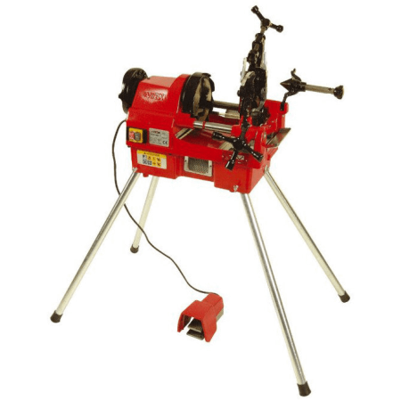 Kompaktowa, idealna do prac w ciasnych miejscach. Imadło blokujące z prętem zabezpieczającym przed momentem, uniemożliwiającym obroty maszyny podczas gwintowania.